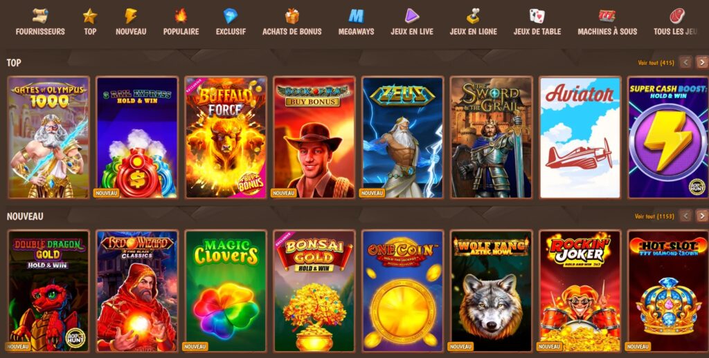 La richesse du catalogue impressionne autant par le nombre que par sa profondeur. Les grands classiques côtoient les dernières créations technologiques : blackjack live, roulette immersive, poker multi-variantes, keno, bingo…